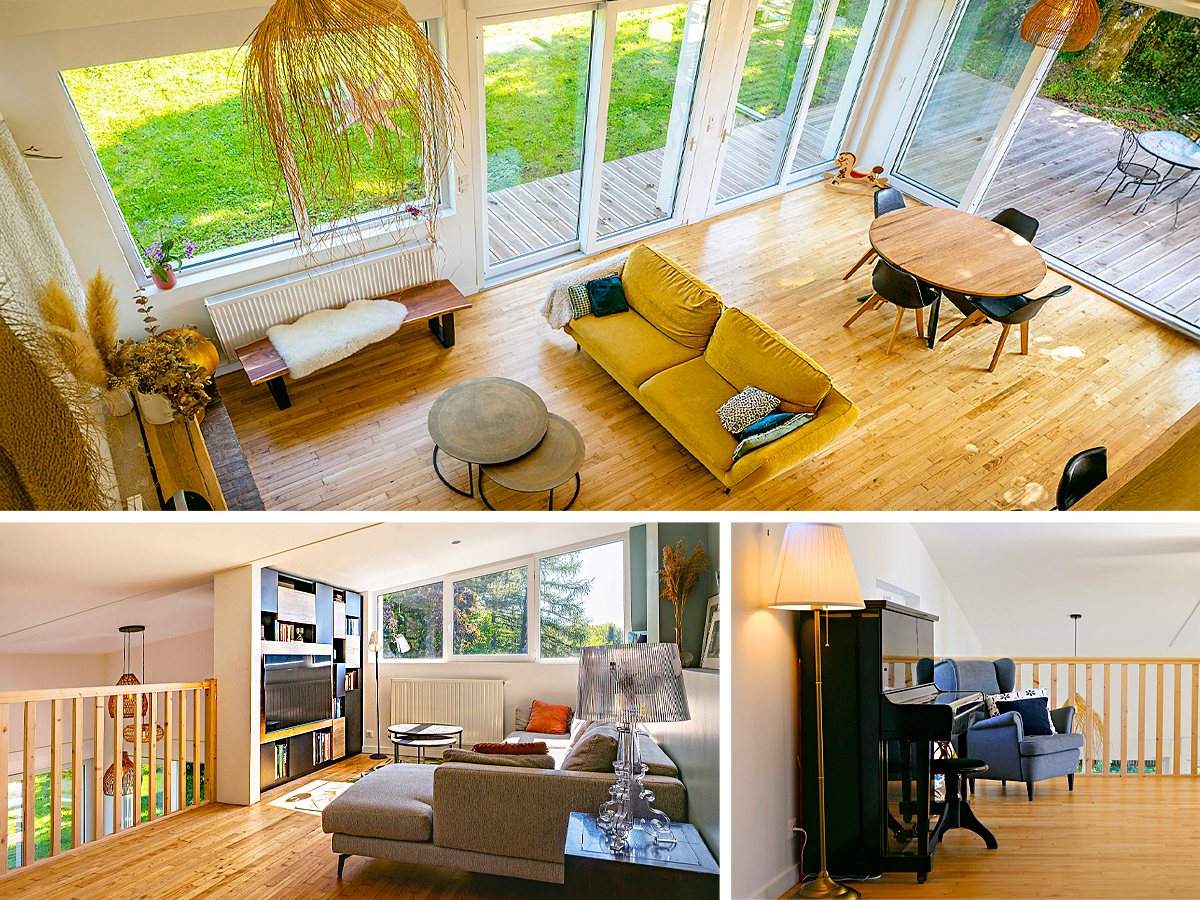 Dès le seuil de la porte franchi vous serrez immédiatement saisi par l'atmosphère qui se dégage de cette propriété. L'architecture caractéristique des années 1960 offre des volumes hors du commun avec une hauteur sous plafond de près de 5m dans la pièce à vivre.