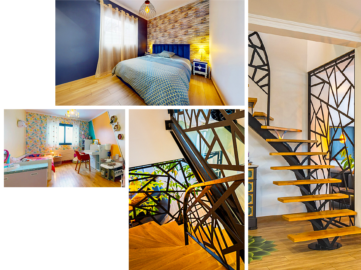 Ouvert sur le séjour, il laisse ainsi circuler la lumière et participe pleinement à l’atmosphère chaleureuse et design de la maison. Plus qu’un simple accès aux espaces nuit, cet escalier devient une signature esthétique forte, affirmant le caractère unique et résolument contemporain de ce bien.
