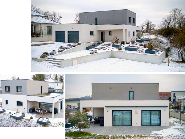 Dès l’arrivée, la maison affirme son identité architecturale. Les volumes équilibrés, les lignes épurées et les larges ouvertures offrent une lecture moderne et élégante de l’ensemble. Les façades aux tons clairs et l’aménagement extérieur soigné créent une atmosphère harmonieuse, à la fois sobre et accueillante. La terrasse de 45 m², parfaitement orientée, devient un véritable espace de vie à ciel ouvert, idéal pour les moments de détente ou de convivialité.