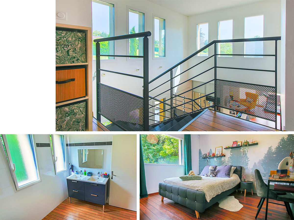 Emprunter le magnifique et imposant escalier de type industriel vous permettra d’accéder aux espaces nuits.